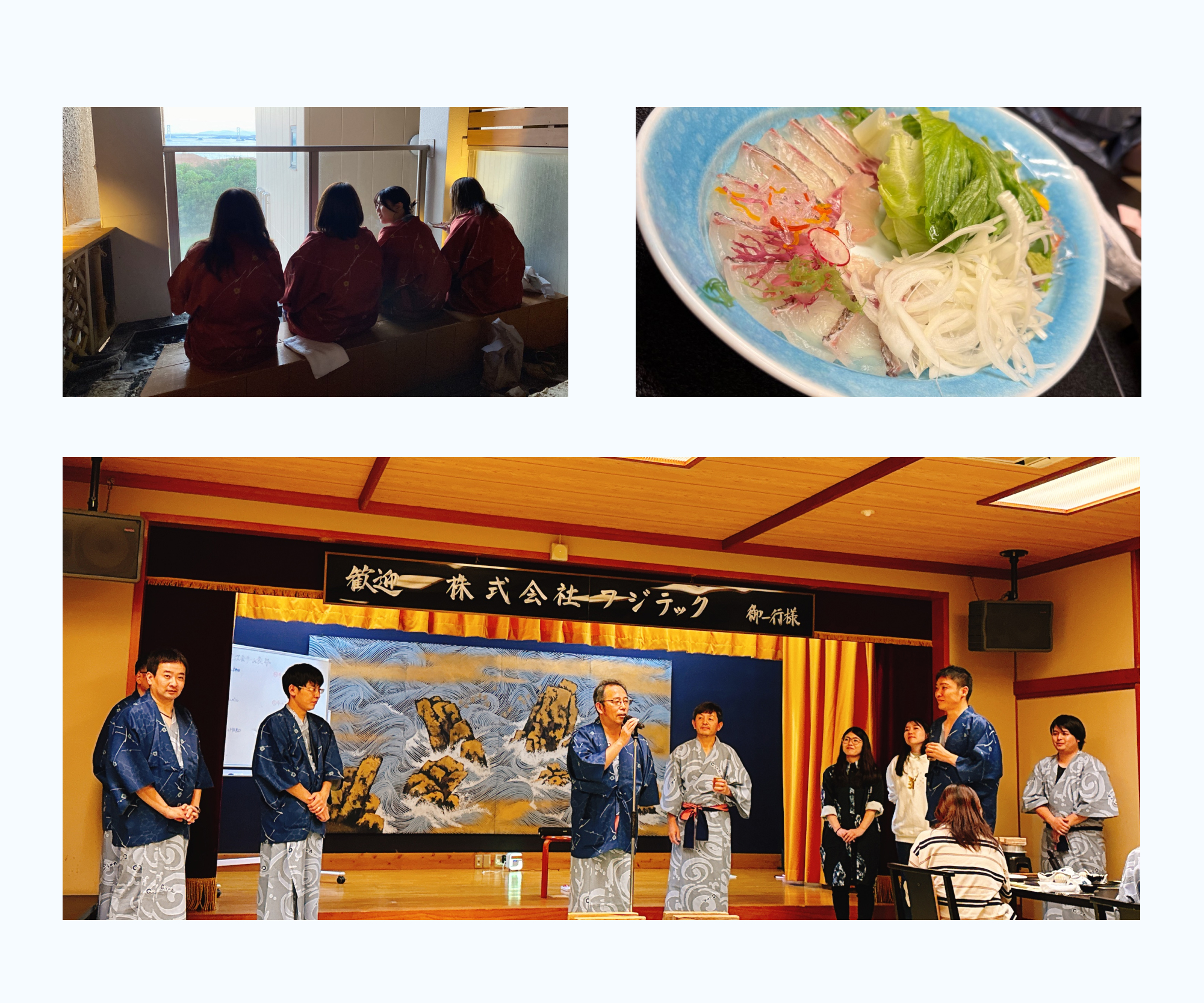 夕食は玉ねぎフォンデュの鯛しゃぶしゃぶがメインで、美味しい鯛料理に舌鼓を打ちました。二次会の出し物もとても盛り上がり楽しい時間を過ごしました。